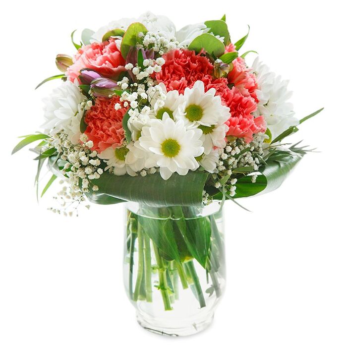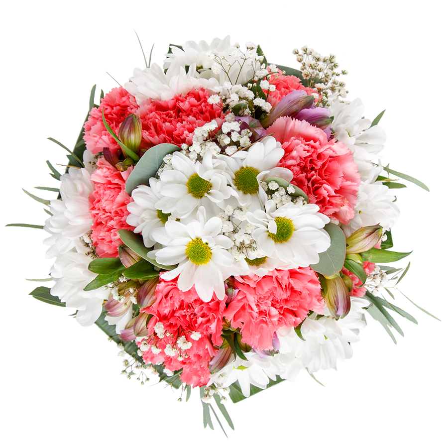 Delight in the splendor and uniqueness of our flower bouquet. This seasonal arrangement features a stunning mix of snow-white chrysanthemums, delicate gypsophila, and soft light pink carnations, beautifully complemented by vibrant aspidistra leaves.